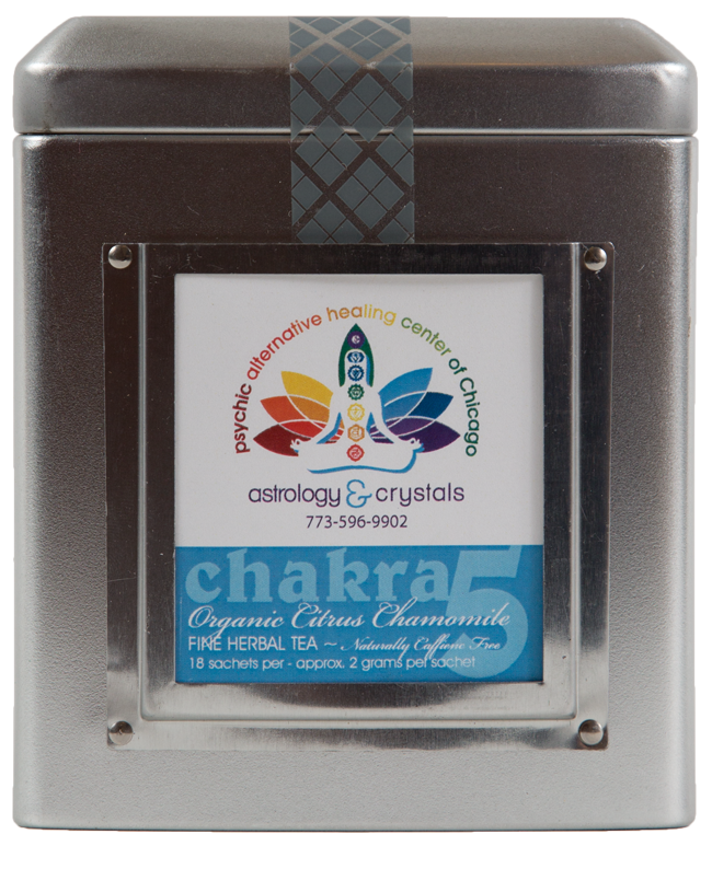 The blue throat chakra tea has a soothing combination of chamomile and hibiscus paired with orange peel and citrus essence. Sip, relax, enjoy. Naturally caffeine-free.