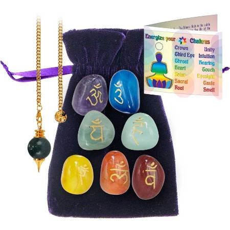 Each stone possesses a unique energy and aids in balancing each Chakra which is essential for optimal well-being. Kit includes a pendulum, seven engraved chakra stones, mini pendulum chart and a velvet pouch.