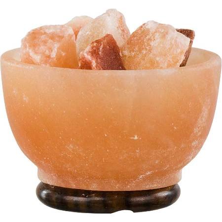 Salt crystal lamp with a wooden base and chunks of salt crystals inside the bowl.